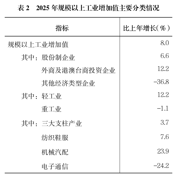 工业:全年工业增加值148.23亿元,比上年增长7.1%,对GDP的贡献率28.1%。规模以上工业增加值增长8.0%。其中股份制企业增长6.6%,外商及港澳台商投资企业增长12.2%,其他经济类型企业下降36.8%;轻工业增长12.2%,重工业下降1.1%;三大支柱产业增长3.7%;年末拥有年产值超亿元工业企业56家,其中超10亿元企业5家。