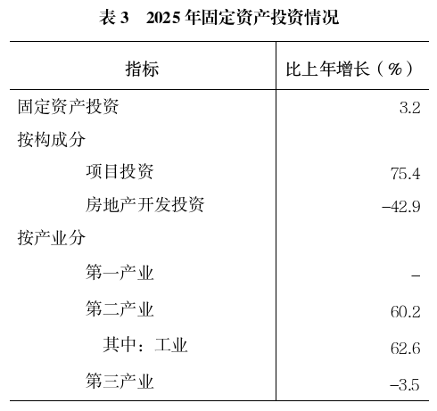 全年固定资产投资比上年增长3.2%。其中项目投资增长75.4%,占固定资产投资66.2%;房地产开发投资下降42.9%,占固定资产投资33.8%。