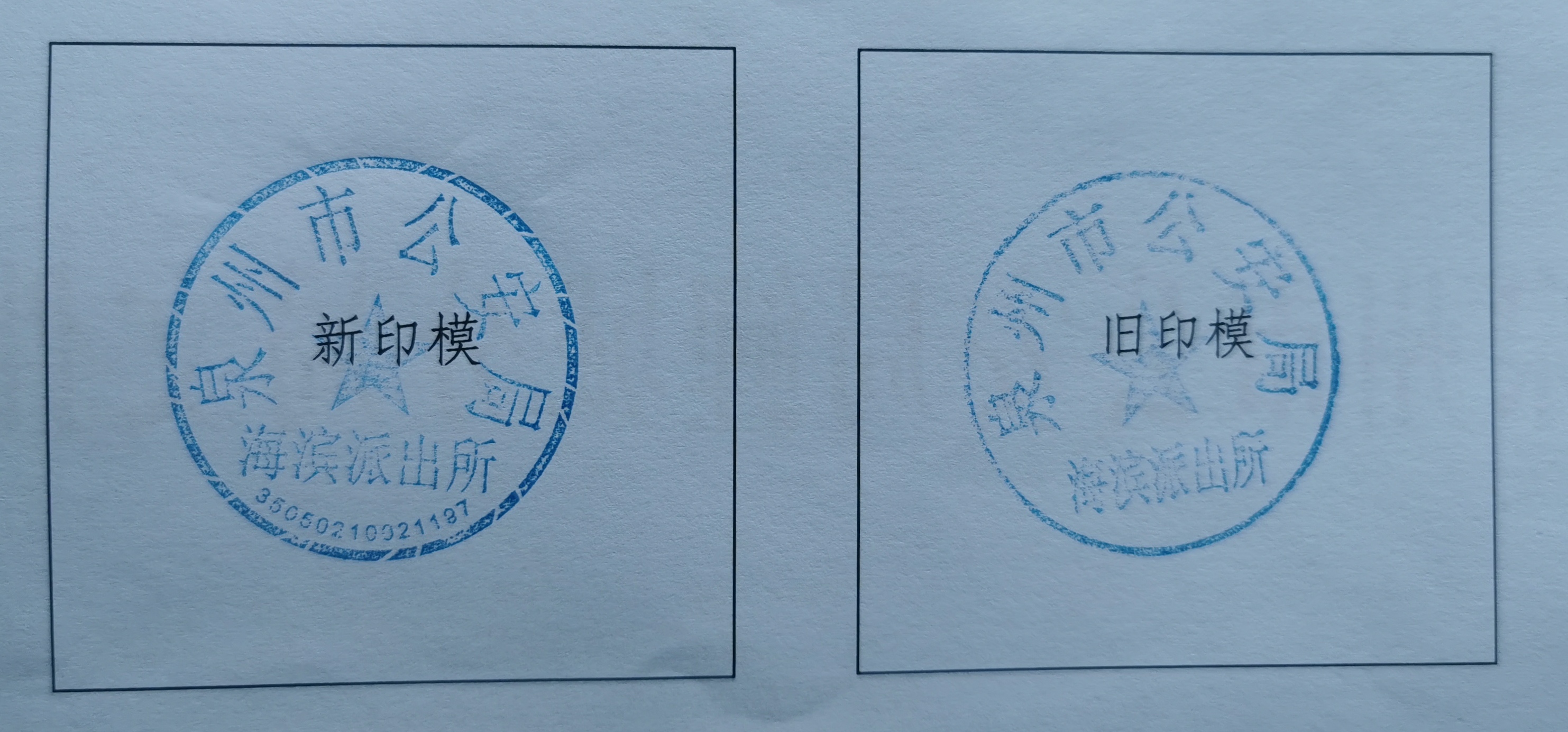 因原“泉州市公安局海滨派出所”木质印章使用年限久,磨损严重,根据《福建省人民政府办公厅贯彻国务院关于国家行政机关和企事业单位社会团体印章管理规定的通知》(闽政办〔2000〕64号)精神,重新刻制“泉州市公安局海滨派出所”铜质印章壹枚。决定自发文之日起启用该印章,原“泉州市公安局海滨派出所”印章同时废止。