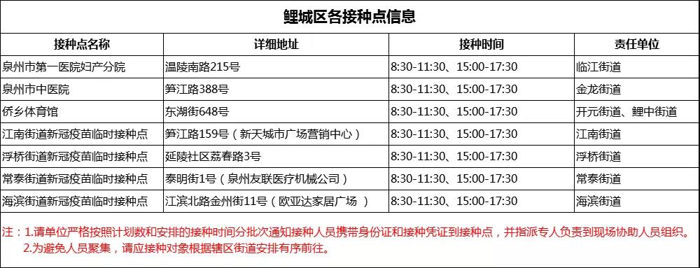 鲤城区新冠病毒疫苗接种点一览表