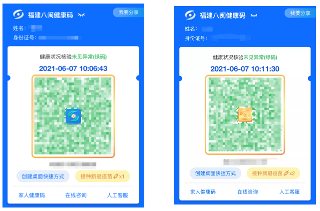 6月7日上午,八闽健康码“新皮肤”正式上线。接种新冠疫苗1剂,绿色健康码边框升级为金色,中间图标为粉花绿叶蓝底;接种新冠疫苗2剂,除金色边框外,中间图标将升级为全金色。