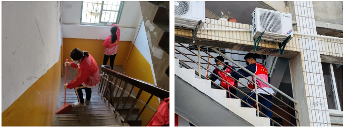 “咦,水都准备好了呀?”在开元社区的电梯厂宿舍,来自培元中学的学生志愿者们准备清洗楼道时,竟发现许多家庭门口整齐摆放着两桶清水。原来,因为楼层较高,取水困难,为减轻志愿者们的负担,行动开展前一天,社区网格员们提前和楼栋居民沟通,邀请在家居民参与清洗,并希望有事外出的家庭提前备好清水。这些提前备好的清水,果然发挥了大作用,再加上居民的参与,清洗效率大大提升,很快,小区庭院、楼道就变得清爽整洁。