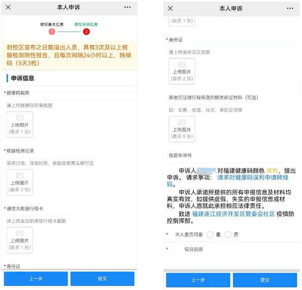 点击下一步,在此页面上传申诉转码所需的证明材料,包括健康码异常原因截图、核酸检测记录、通信大数据行程卡、身份证正反面、车票、社区、街道、单位证明等,并同意自愿申诉书。