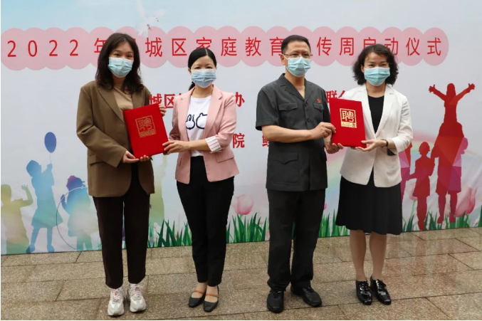 区人民法院院长李清坝、区妇联主席李艳珠为家庭教育指导师颁发聘书。