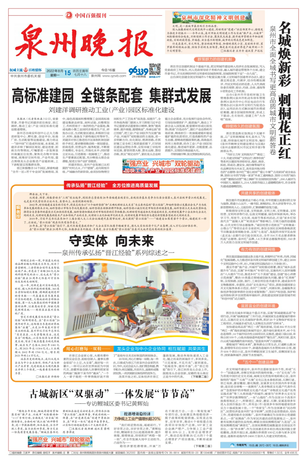 “围绕全年目标,鲤城将持续贯彻落实好‘强产业、兴城市’双轮驱动‘1+3’专项行动,全面鼓足‘活古城’的强劲势头,全面吹响‘战江南’的冲锋号角,进一步提振精神,加压奋进,全力冲刺三季度,奋力决战四季度,努力交出一份高质量发展答卷。”鲤城区委书记黄辉灿在接受采访时表示,将传承弘扬“晋江经验”,按照市委、市政府的统一部署,在“世遗典范城”创建中勇毅担当,在“市区一体化”建设中奋勇争先,以实际行动迎接党的二十大胜利召开。