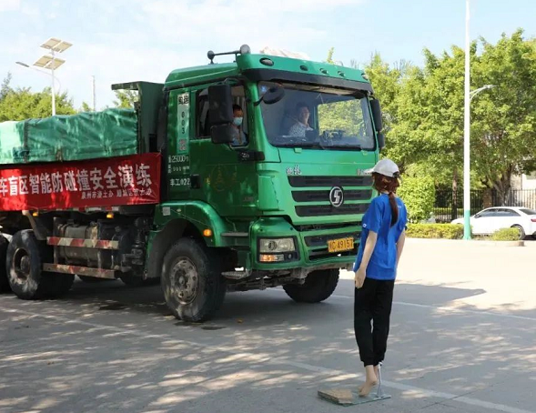 原来,这是由泉州市渣土办、鲤城区渣土办联合举办的渣土车盲区动态演练活动,模拟的是车辆与行人或非机动车在盲区相遇的场景。“渣土车体积大、驾驶室高,行驶过程中存在许多视觉盲区,尤其是转弯盲区事故频发,2021年以来,全市的渣土车安全事故中,车辆右侧盲区伤亡事故占比90%左右。”市渣土办工作人员介绍,测试车辆能够及时发出警报并紧急制动,这一切主要归功于车辆装载的盲区智能防碰撞系统。