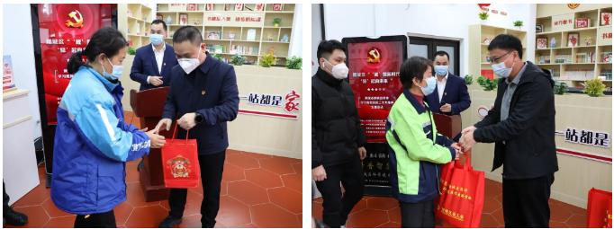 现场领导为新业态新就业群体、户外劳动者职工代表们赠送党的二十大精神学习辅导书籍,送去冬日暖心关爱礼包