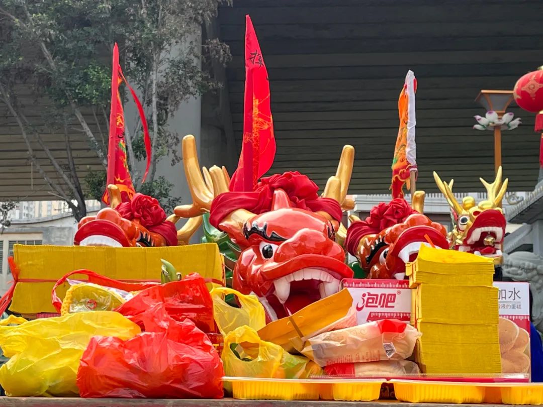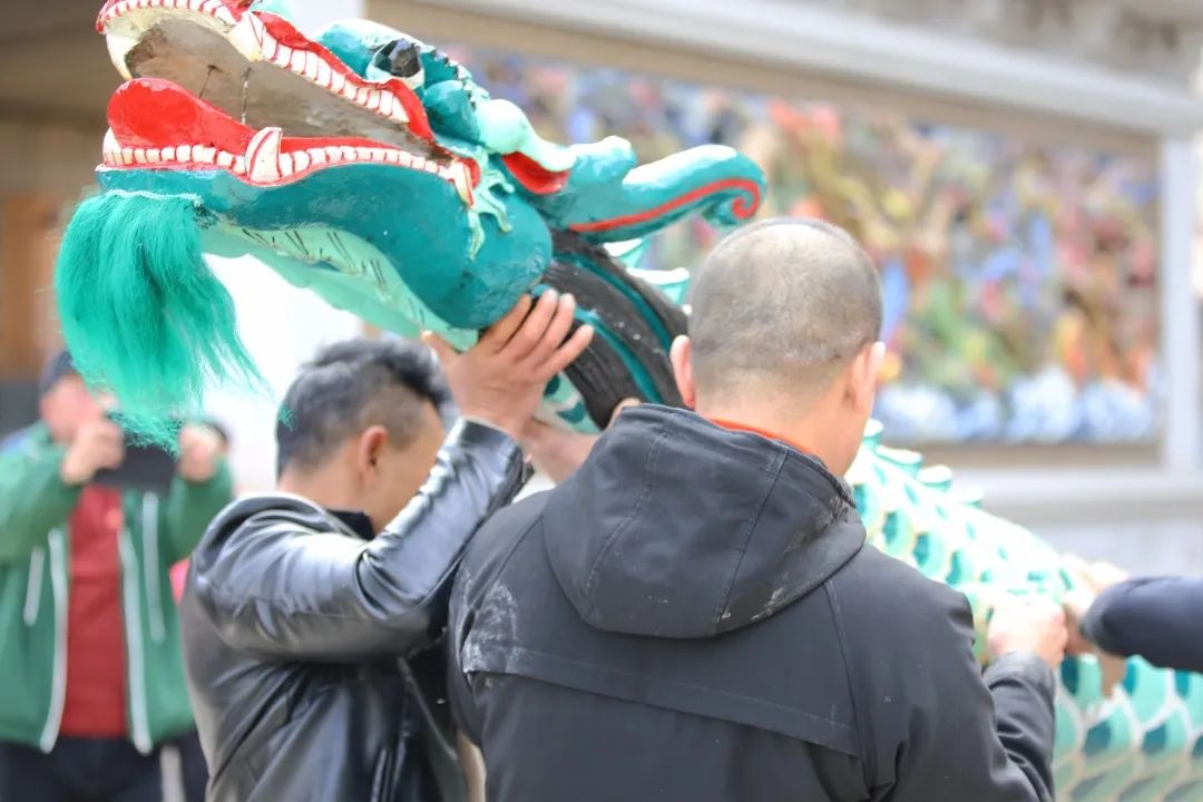 下午3点,浮桥龙舟队的20多名队员齐心协力,将三艘龙舟依次从浮桥观音寺内抬到笋江边,仔细擦拭清洗,接上龙头、龙尾,放上锣鼓,插上大旗。随后,他们对龙舟进行祭拜祈福,并为龙头披红点睛。