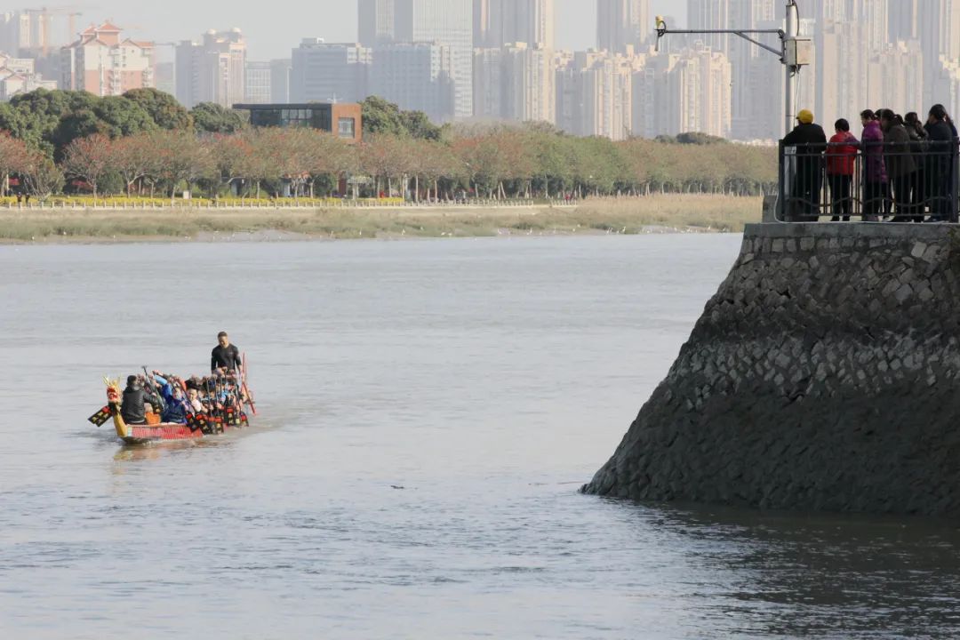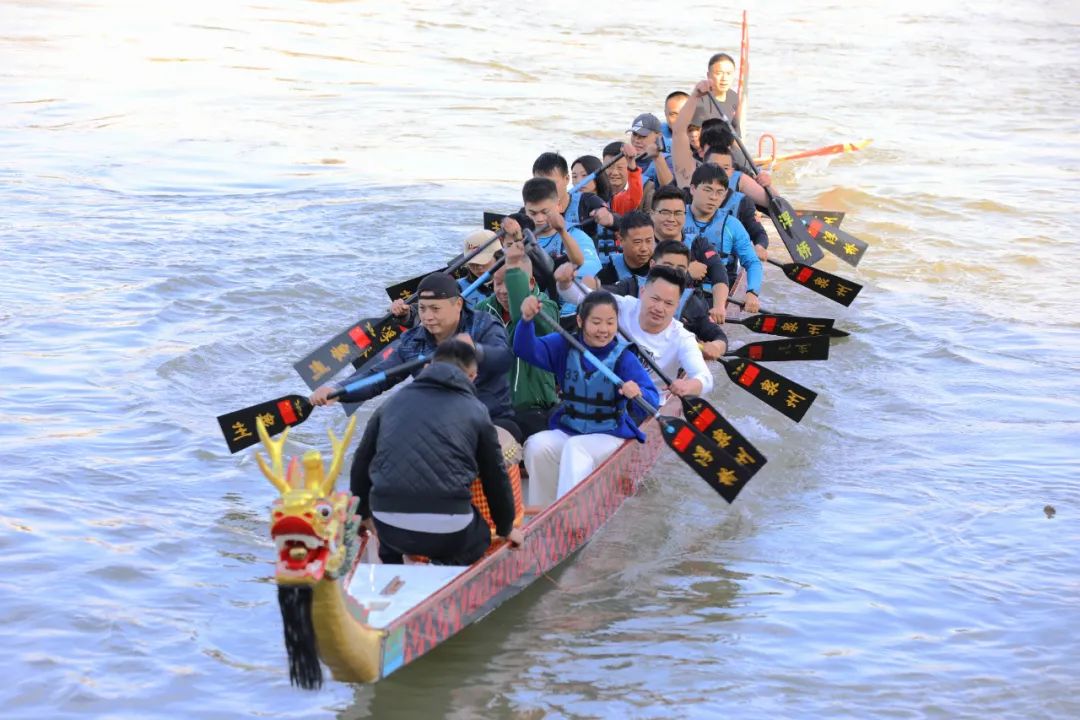 哨声响、鼓点起,队员们奋力挥动船桨,一时间舟楫翻飞、浪花四溅,龙舟犹如离弦之箭飞驰而去,大家奋力拥抱春天的同时,也完成了新年首训。