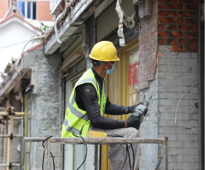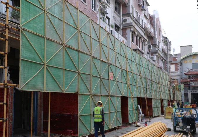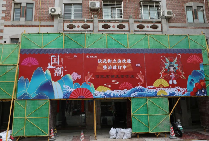 走进状元街,记者看到,施工方以状元街各个出入口为界限,将街区分为三个施工区域,街区两侧部分楼栋脚手架已完成搭盖,各个施工区域内都有工人们在穿梭忙碌,部分工人们正忙着对老旧破损墙面、店家私自搭建广告牌等进行拆除。