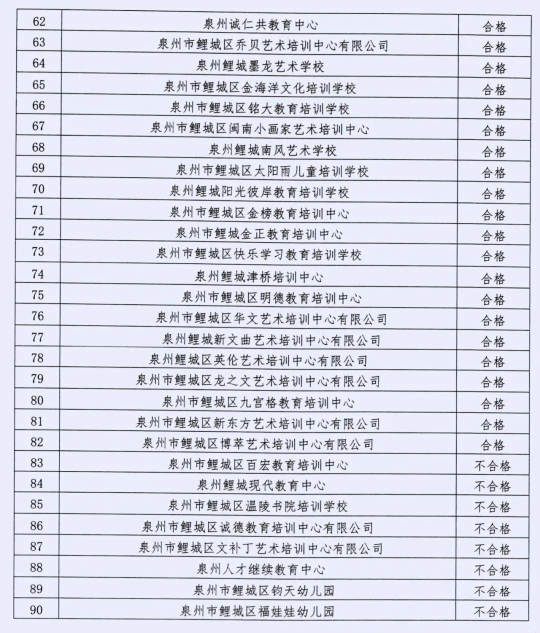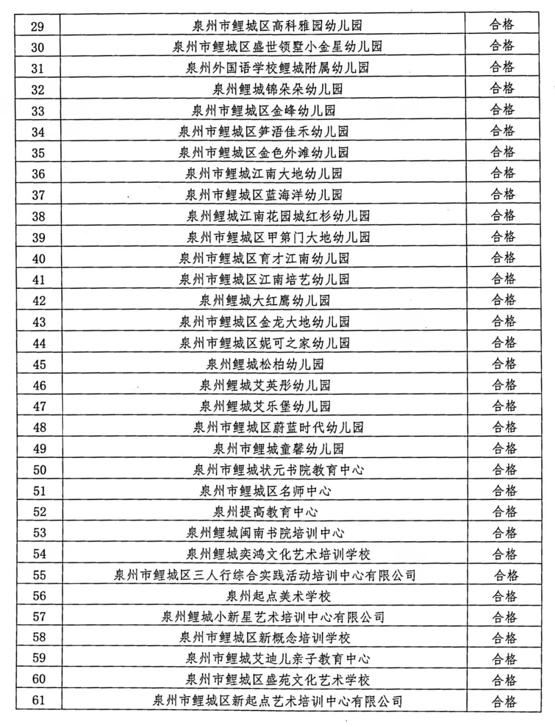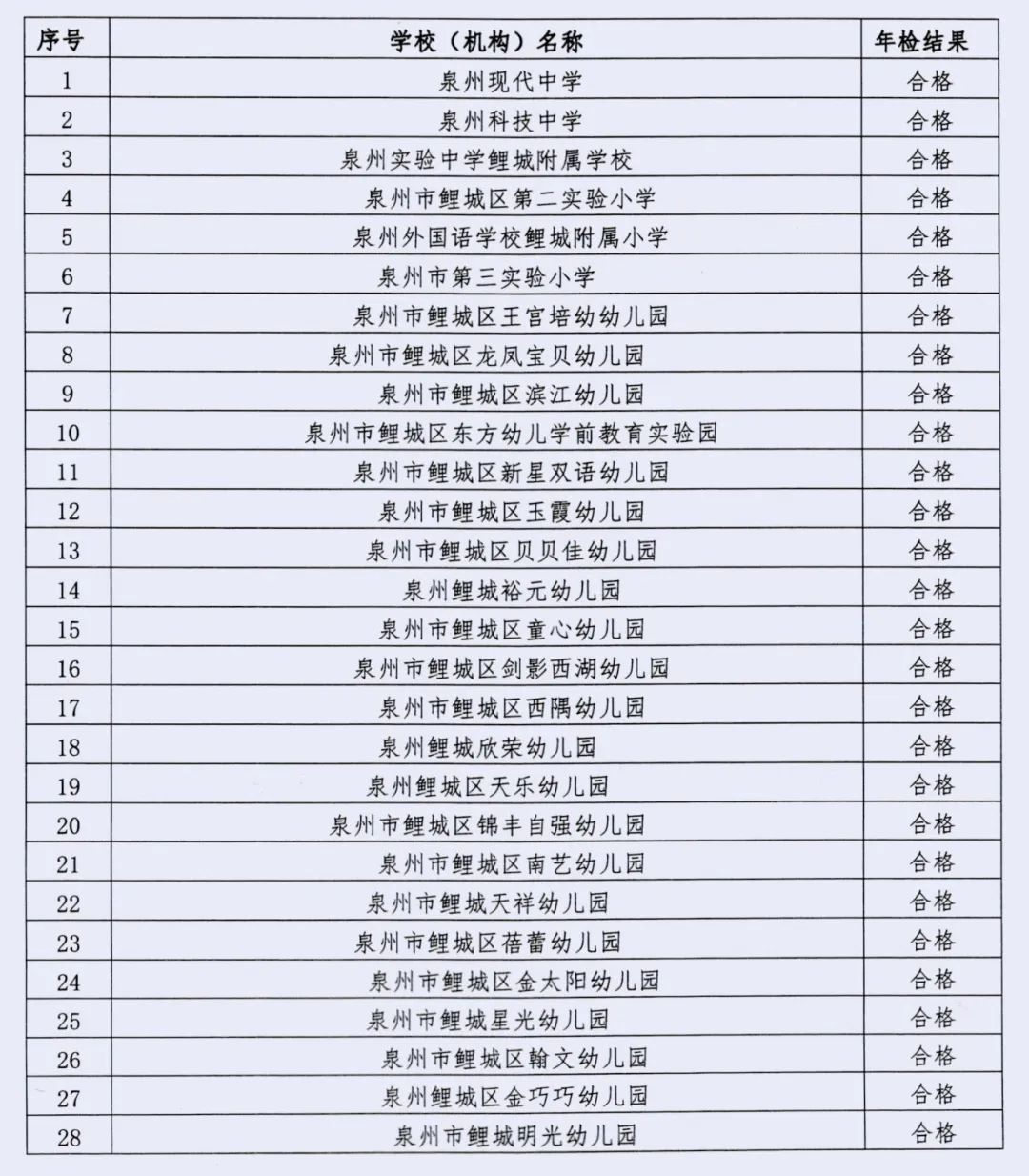 鲤城区属民办学校(机构)年检名单及年检结果