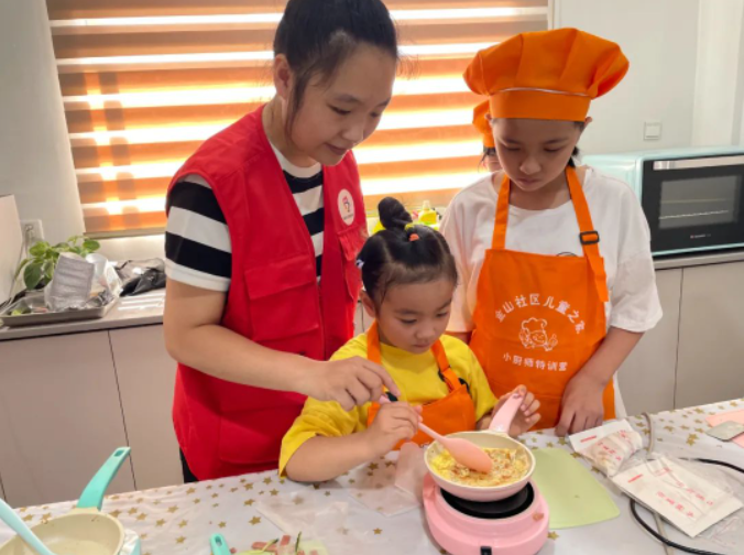 在小厨师课堂上,大学生志愿者指导暑托班学生