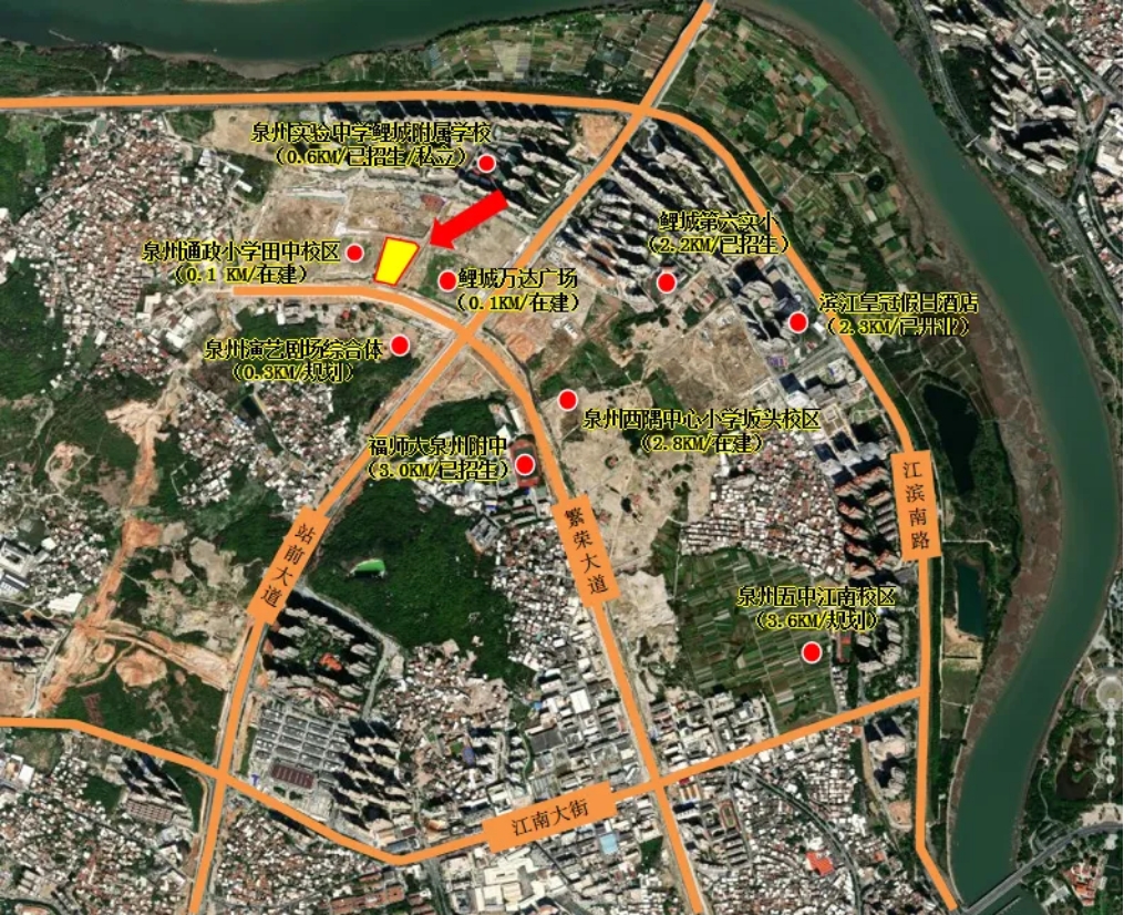 地块位于泉州市通政中心小学田中校区与鲤城江南万达中间,据悉,泉州市通政中心小学田中校区规划了36个班,将新增学位1600个,预计今年九月可对外招生。另外,鲤城江南万达广场在建中,目前金街部分楼栋已封顶。