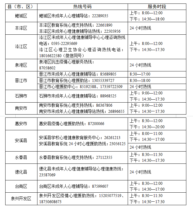 为更好地面向广大师生开展疫情相关的心理辅导工作,泉州市本级和各县(市、区)继续开通学生心理服务热线,为全市学生提供心理咨询服务。现将心理服务热线开通情况公布如下:
