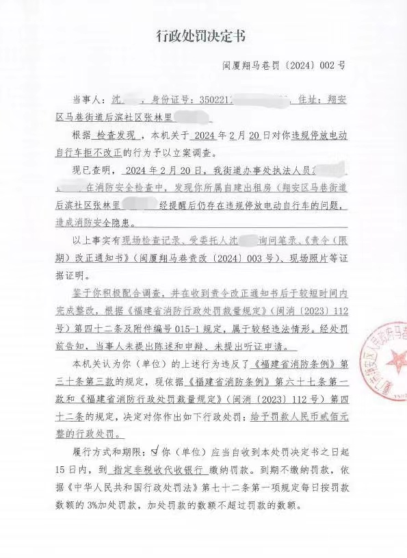2024年2月,马巷街道办执法人员对后滨社区张林里一处自建出租房开展消防安全检查中,发现存在电动自行车违规停放在楼梯间且拒不改正的行为,违反了《福建省消防条例》第三十条第三款之规定。马巷街道办根据《福建省消防条例》第六十七条第一款和《福建省消防行政处罚裁量规定》第四十二条之规定,依法对责任人沈某作出罚款的行政处罚。
