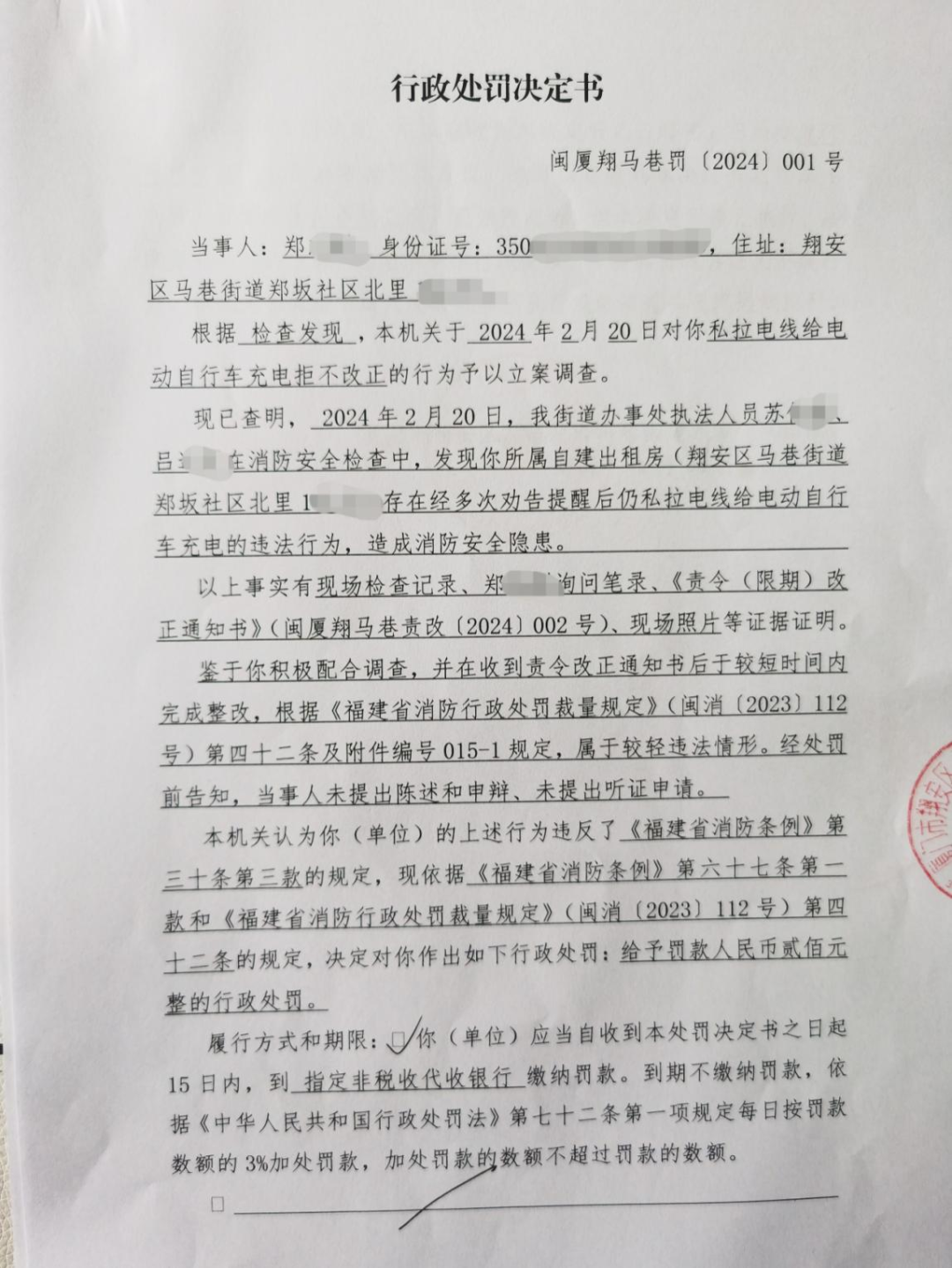 2024年2月,马巷街道办执法人员对郑坂社区北里一处自建出租房开展消防安全检查中,发现存在房东私拉电线给电动自行车充电且拒不改正的行为,违反了《福建省消防条例》第三十条第三款之规定。马巷街道办根据《福建省消防条例》第六十七条第一款和《福建省消防行政处罚裁量规定》第四十二条之规定,依法对该自建出租房房东郑某作出罚款的行政处罚。