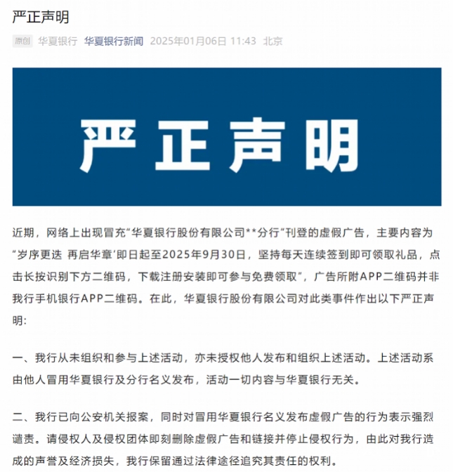 1月6日,华夏银行通过其官方微信公众号发布了一则重要声明,针对近期网络上出现的冒用该行名义发布虚假广告的行为作出正式回应。
