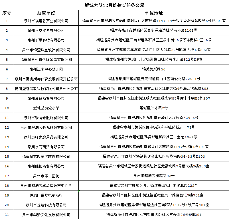 为全面推行“双随机、一公开”监管改革,进一步落实消防监督检查工作,创造良好的消防安全环境,自2021年12月1日至12月31日,鲤城区消防救援大队将在全区范围开展“双随机、一公开”消防监督抽查,现将随机抽取的监督检查对象公告如下: