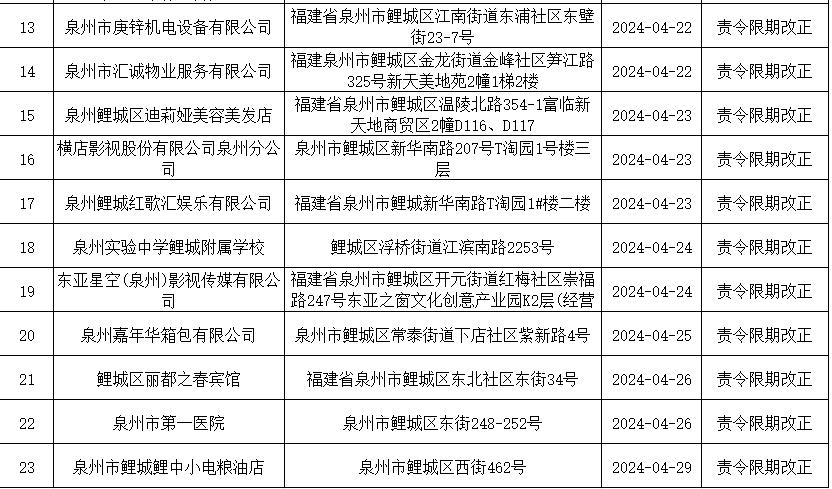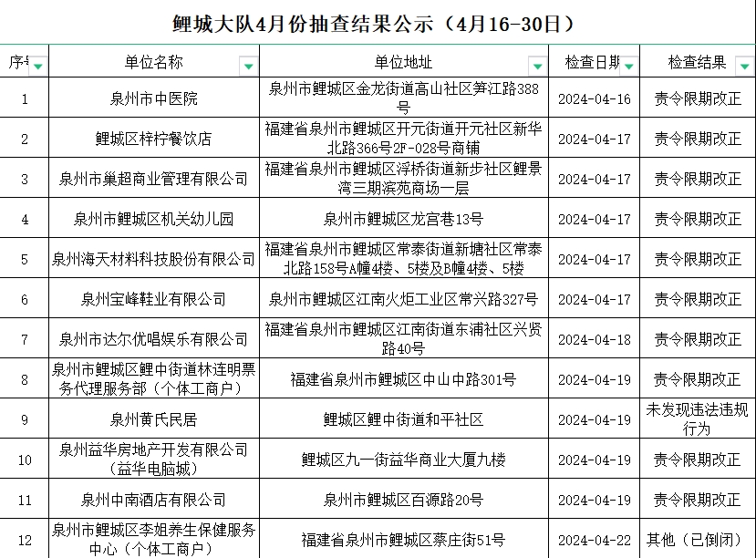 为强化社会面火灾防控,确保辖区火灾形势持续稳定,根据《中华人民共和国消防法》、《消防监督检查规定》、《福建省“双随机、一公开”消防监督抽查实施细则(试行)》等法律法规及文件规定,4月16日—30日,鲤城区消防救援大队按照随机抽取检查对象,随机选派检查人员的抽查机制,依法对辖区23家单位场所进行消防监督抽查。现将抽查结果公示如下: