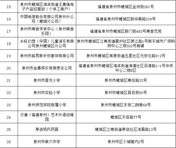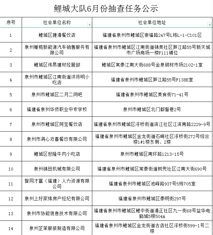 为全面推行“双随机、一公开”监管改革,进一步落实消防监督检查工作,创造良好的消防安全环境,自2024年6月1日至6月30日,鲤城区消防救援大队将在全区范围开展“双随机、一公开”消防监督抽查,现将随机抽取的监督检查对象公告如下: