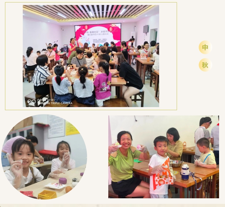 在古店社区、金柄社区新时代文明实践站,社区邀请辖区居民、大小朋友们一起欢度中秋节。在志愿者的指导下,大家围坐一堂,动手制作出一块块精美的冰皮月饼,品尝着美味的“中秋情”,现场气氛十分热烈。