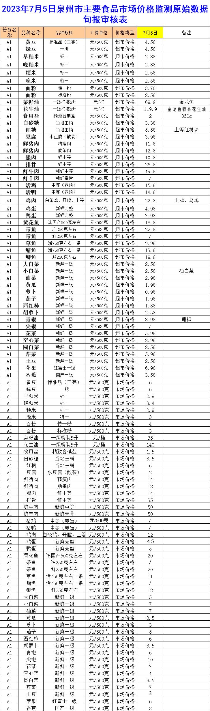 2023年7月5日泉州市主要食品市场价格监测原始数据旬报审核表
