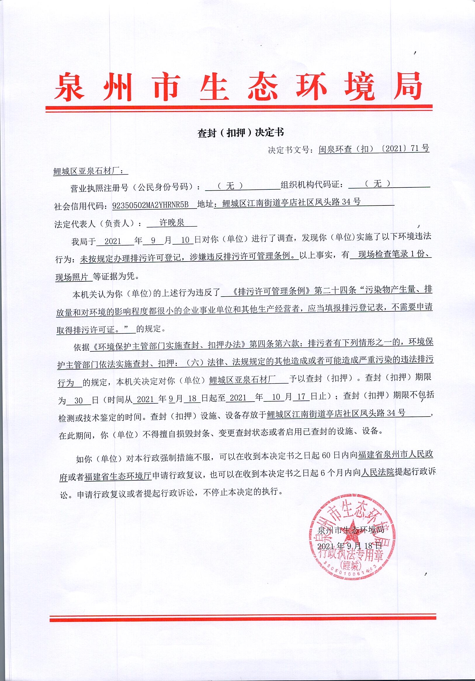 查封(扣押)决定书 闽泉环查(扣)〔2021〕71号