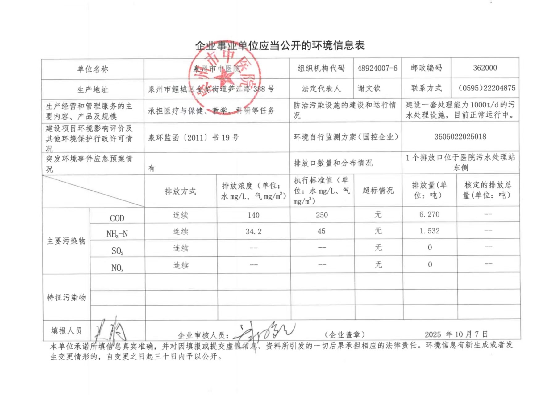 泉州市中医院2025年第三季度环境信息公开表