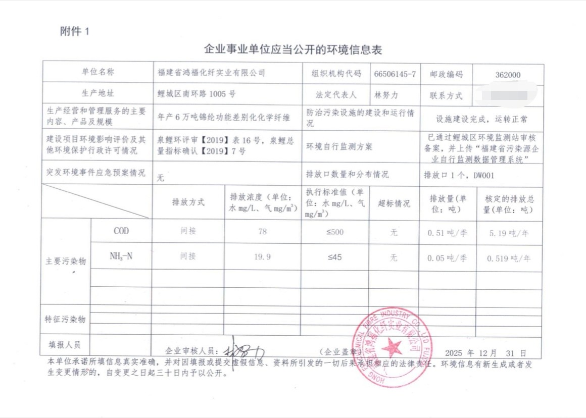 福建省鸿福化纤实业有限公司2025年第四季度环境信息公开表