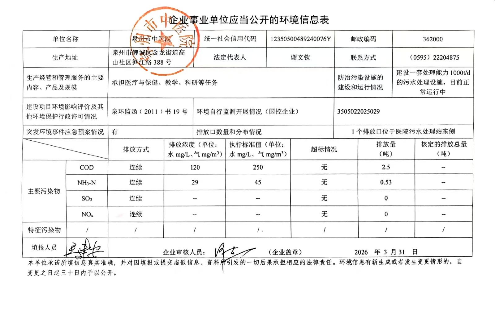 泉州市中医院2026年第一季度环境信息公开表