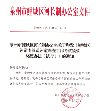 近日,鲤城区出台《鲤城区河道专管员河道巡查工作考核绩效奖惩办法(试行)》(以下简称为《办法》)。