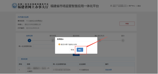 2.出现弹窗提示,用户可根据实际情况,选择是否办理个人独资企业转型为企业业务,如需办理则点击【确认】。
