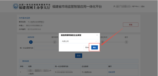 3.目前支持转型的企业类型包括内资公司、外商投资公司,选择欲转型的企业类型后,点击【确认】。