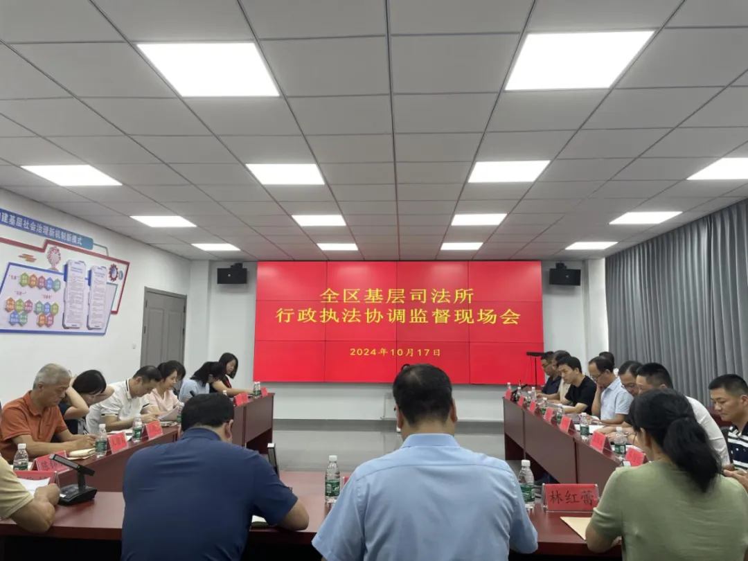 10月17日下午,区委依法治区办、区司法局在金龙司法所召开基层司法所协助行政执法协调监督工作现场会,总结金龙司法所试点经验成效,由点到面,在全区推广司法所行政执法协调监督工作。区委常委、区委依法治区办主任曾朝阳,市司法局执法监督科科长吴荣灿,区司法局局长林红蕾,各街道分管副书记及综合执法队队长,各司法所所长参加会议。