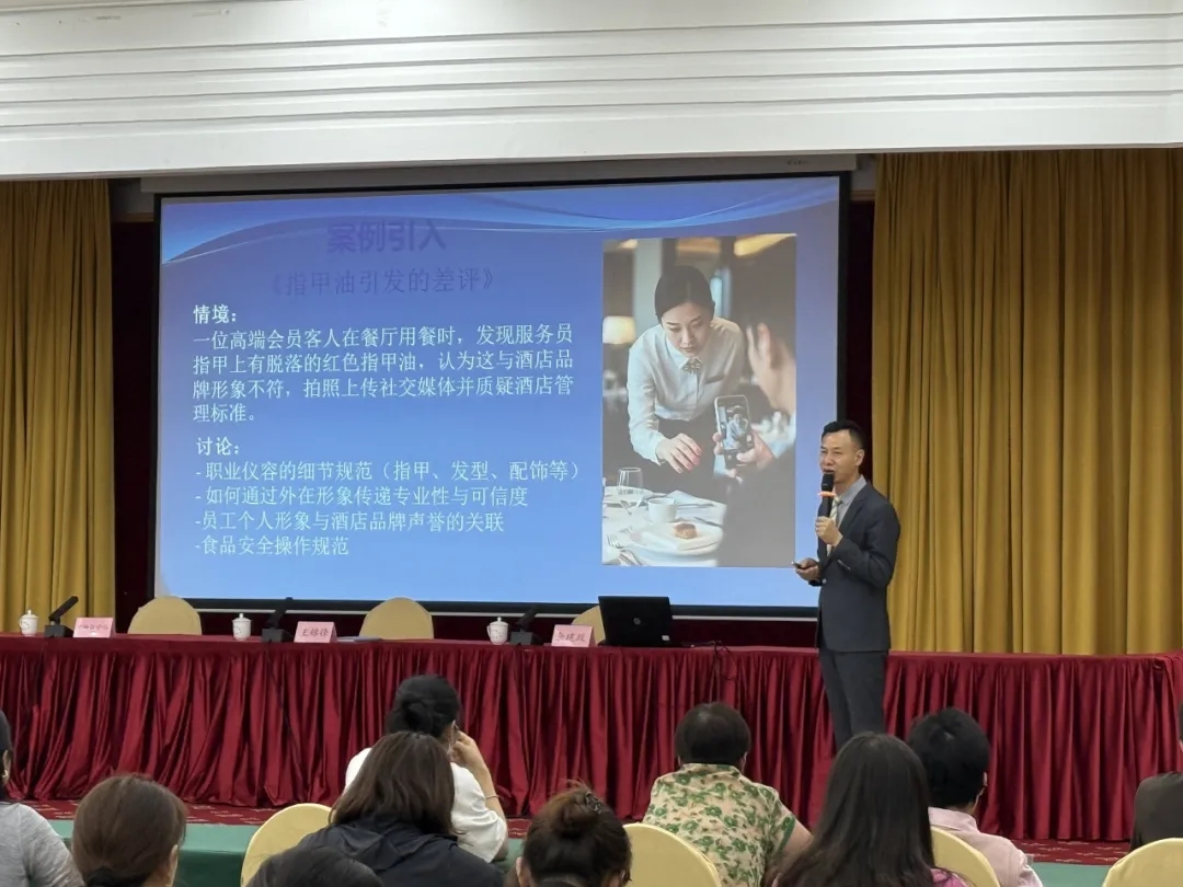 培训会上,区市场监管局相关负责同志详细解读了节日期间餐饮、住宿单位做好食品安全、假期客房定价及相关注意事项。泉州酒店食品安全经理兼餐饮管事部经理余建政从服务礼仪规范和严把食品安全关两大方面进行系统讲解分析,与现场参训人员实时互动,通过情景模拟演练食品安全突发事件应急处置流程。“培训内容非常实用,特别是食品安全管理方面的讲解,对我们做好假期接待工作很有帮助”。东南半岛酒店餐饮总监颜容表示。