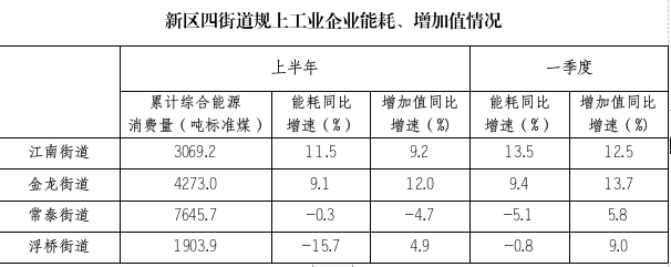 分街道看,上半年新区四街道规上工业企业综合能源消费量累计达16891.7吨标准煤,占全区比重达96.8%,同比增长1.8%,高于全区平均水平0.4个百分点。受不同产业结构影响,四街道用能效率分化明显,同一季度相比,除浮桥街道外其余三街道节能降耗工作均趋于弱化。其中,常泰街道综合能耗同比下降0.3%,高于增加值增速4.4个百分点;江南街道综合能耗同比增长11.5%,高于增加值增速2.3个百分点;金龙街道综合能耗同比增长11.5%,低于增加值增速2.9个百分点,增加值与能耗增速差值较一季度下滑1.4个百分点。