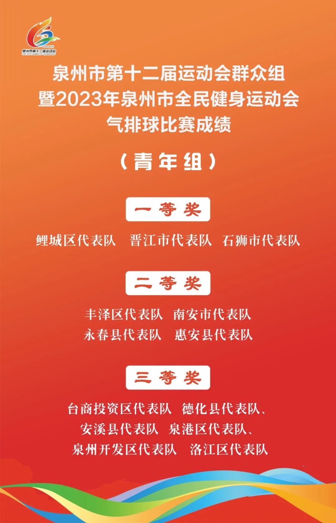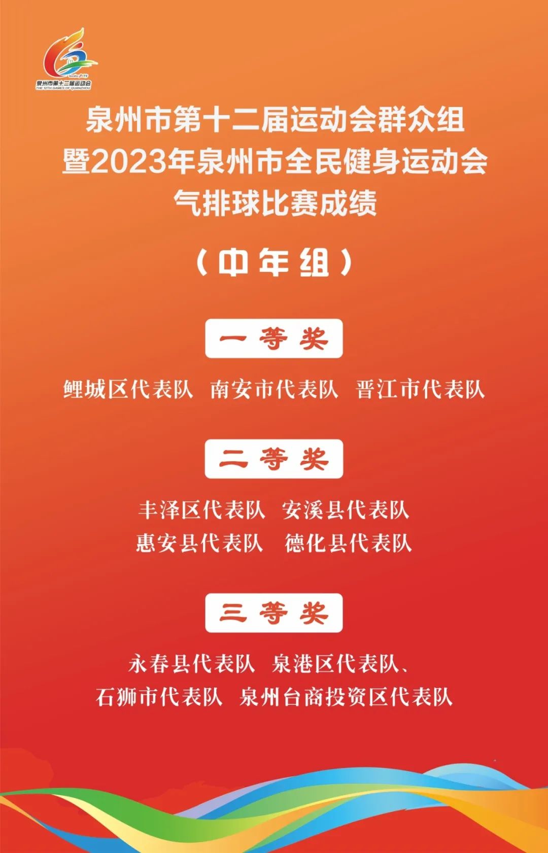 近日,泉州市第十二届运动会群众组暨2023年泉州市全民健身运动会气排球比赛在安溪县圆满收官.泉州市体育局副局长汪国庆出席闭幕仪式并颁奖.