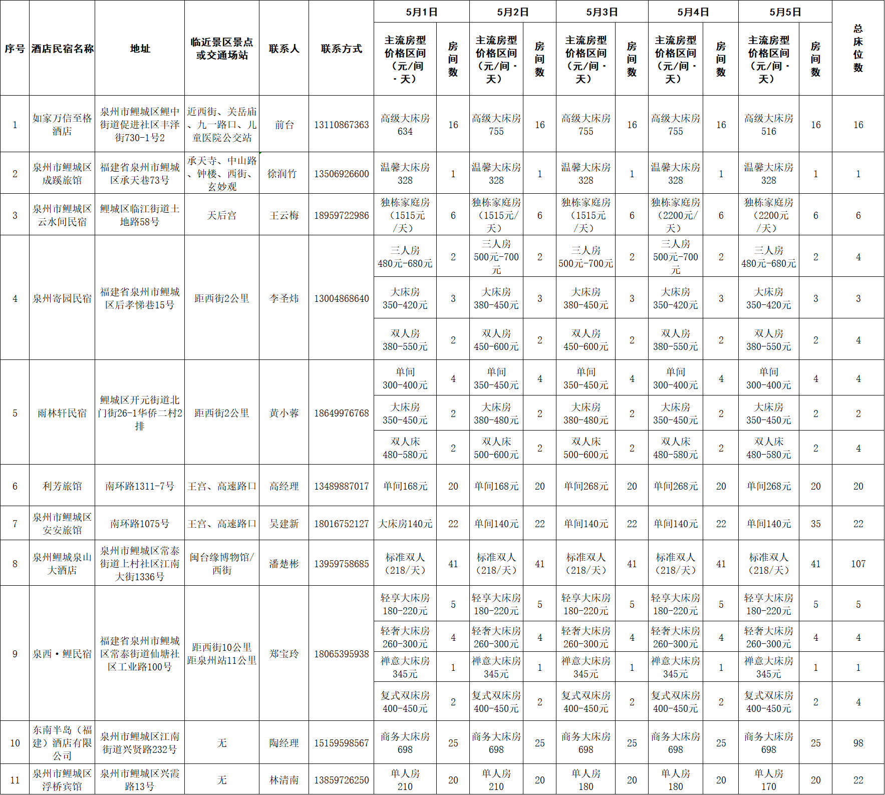 为迎接即将到来的“五一”长假,充分彰显“宋元中国·海丝泉州”的“宠客”热情与诚意,泉州市精心推出101家“亲民价格酒店民宿”名单,覆盖全市13个县(市、区),其中鲤城共11家,临近主要景区景点、网红打卡点、交通枢纽等区域,包括星级酒店、商务连锁酒店、宾馆、民宿等多种类型,为八方来客提供类型丰富、出行便捷、价格亲民的住宿选择。